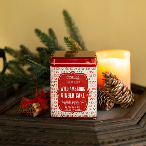 Williamsburg Ginger Cake je bohatý černý čaj inspirovaný slavnými perníkovými koláčky z Colonial Williamsburg. Hřejivá směs hřebíčku, skořice a melasy vytváří autentickou sváteční chuť, která zahřeje domov i duši. Každým šálkem podporujete zachování historického dědictví Williamsburg.
