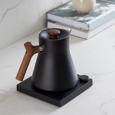 Fellow Corvo EKG Pro Studio Edition je prémiová rychlovarná konvice, která kombinuje přesnost, rychlost ohřevu a elegantní design. Reflexní skleněná základna a kovové dotykové prvky vytvářejí moderní, sofistikovaný vzhled, zatímco ořechové rukojeti dodávají teplý a luxusní pocit.