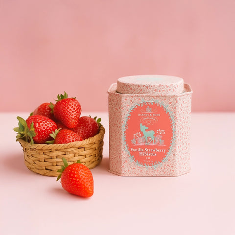 Celebrate the freshness of Vanilla Strawberry Hibiscus tea. This vibrant yet caffeine-free blend combines the refreshing tartness of organic hibiscus with the sweet and creamy notes of strawberry and vanilla. Organic rooibos and orange peel add a rich, fruity base that balances the tartness of the hibiscus, creating a refreshing and invigorating cup. Perfect for playful tea parties – enjoy this all-natural, sugar-free blend with friends of all ages, whether they’re real or just in your imagination.